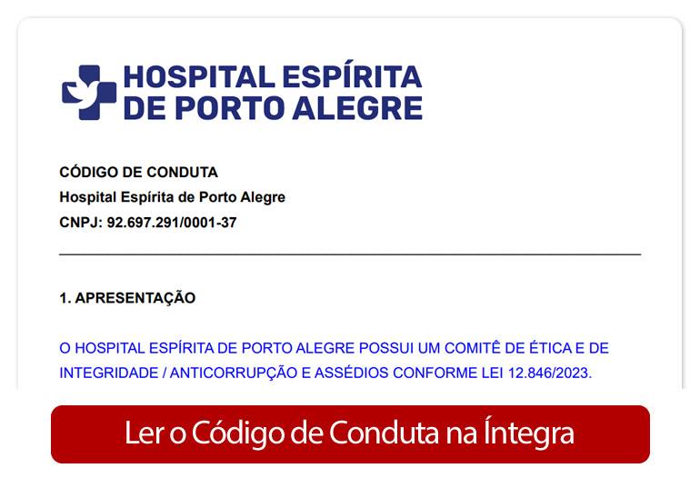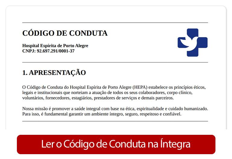 Este é um canal disponível para públicos internos e externos, exclusivo para comunicar alguma inconformidade com o Código de Conduta do Hospital Espírita de Porto Alegre. Assuntos fora deste objetivo não serão conduzidos por esta área e deverão ser comunicados ao nosso Setor de Ouvidoria.